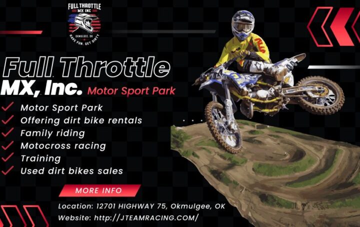 Full Throttle MX, Inc. manages Jandebeur’s Motor Sport Park—an Oklahoma destination for riders of all ages and skill levels. Whether you’re brand-new to dirt bikes or a long-time motocrosser, you’ll find a safe, welcoming place to ride, learn, and race.